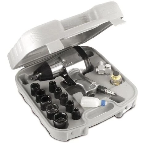 12,7 mm (1/2″) Schlagschrauber mit 4-stufiger Kraft-Einstellung, Rechts-/Linkslauf und komplettem Zubehör im Kunststoffkoffer. Technische Daten: – Betriebsdruck 6,3 bar – Luftverbrauch 140 l/min – Drehmoment 312 Nm – Leerlaufdrehzahl ca. 7000 U/min – Antrieb 12,7 mm (1/2″) Lieferumfang: – Schlagschrauber – 10 Kraft-Stecknüsse (9-10-11-13-14-17-19-22-24-27 mm) – 1 Verlängerung 125 mm – 1 Öler – 1 Ölkännchen mit Spezialöl – Anleitung