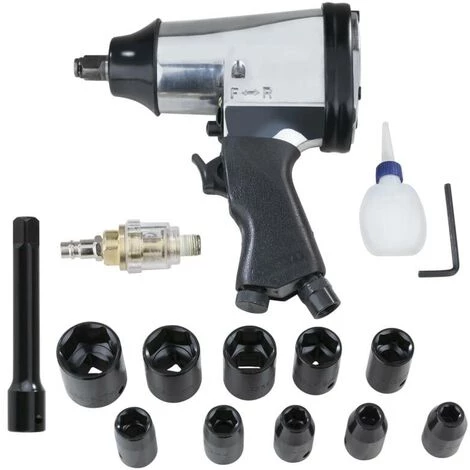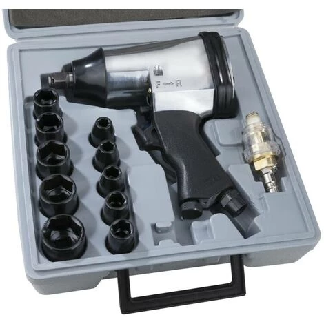 * Für den Einsatz in Werkstätten beim Reifenwechsel * Ideal für Montagearbeiten. * Rechts-/Links-Lauf mit einfacher Umschaltung Technische Daten * Drehzahl 7000 min-1 * Drehmoment 312 Nm * Luftbedarf Ø: 141 L/min * Antrieb: ½ * Druckluftanschluss: R ¼ Lieferumfang * 10 x 1/2 Steckschlüssel (9 / 10 / 11 / 13 / 14 / 17 / 19 / 22 / 24 / 27 mm) * 1 x Verlängerung 125 mm * 1 x Mini-Öler * 1 x Öl-Fläschchen (leer) * 1 x 4 mm Sechskantschlüssel * 1 x Druckluftanschluss * 1 x Abdeckkappe * Inklusive Transportkoffer Abmessungen (L x B x H): 180 x 198 x 60 mm Gewicht: 204 kg